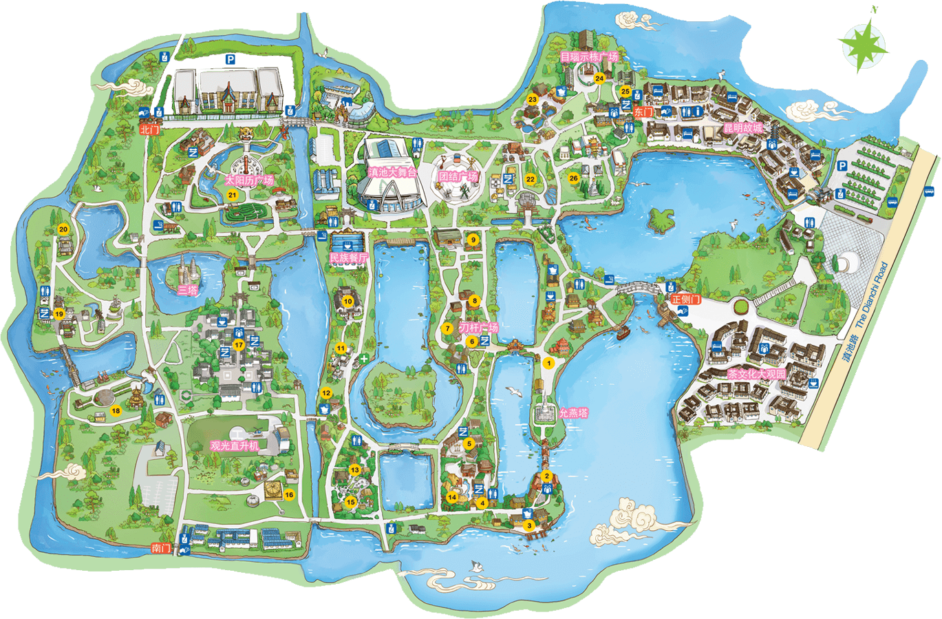 佤族人口約36萬,主要聚居在云南省瀾滄江南段以西的阿佤山區。佤族寨位于“翠漪洲”東南角。寨內分布有茅草頂的干欄式建筑群、牛頭廣場、神靈廣場、司崗里石雕以及糧倉等。牛頭廣場是佤族古老的剽?;顒訄鏊瑘稣械呐=菫樨糇宓恼瘶叮瑥V場前的兩個石人分別為佤族的男性和女性祖先。神靈廣場表現了佤族萬物有靈、靈魂不死的自然崇拜觀念。場中兩個石人雕像分別為佤族最崇拜的“木依吉”和“阿依娥”。佤族木鼓舞節拍鮮明強烈,...